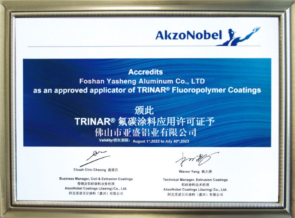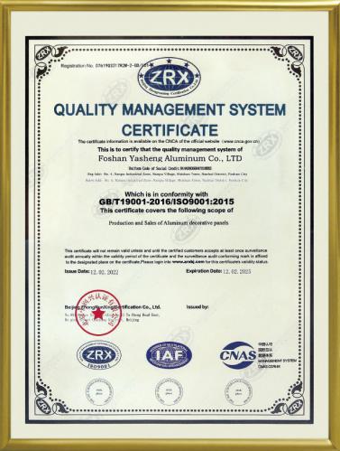 公司現已全面通過ISO9001:2008國際質量管理體系認證。鋁單板和鋁蜂窩板的產品質量均通過了國家建材測試中心檢測。涂層質量技術已達到美國AAMA2605的要求。板材的物理性能和其他質量技術指標均達到美國ASTM標準。公司本著“重質量、重誠信、重創新、重服務”的理念,堅持用戶至上,服務周全原則,用心解決客戶所憂;以科技和優質產品服務客戶;始終堅持以“想顧客之所想,急顧客之所急”的經營理念,不斷開拓創新,與時俱進,使“亞盛”品牌系列產品得到市場、客戶和專家的一致認可和深受廣大國內外客戶的好評。