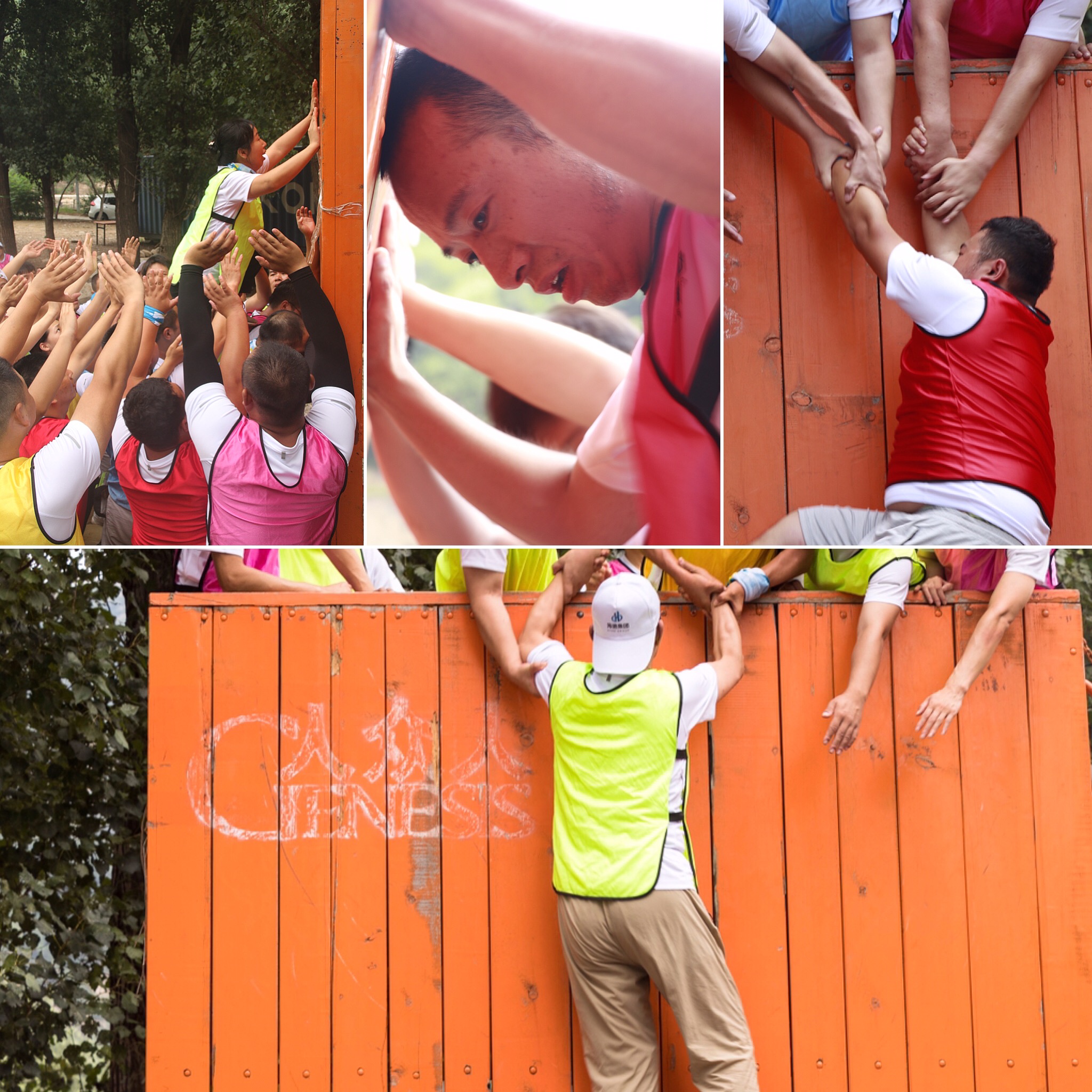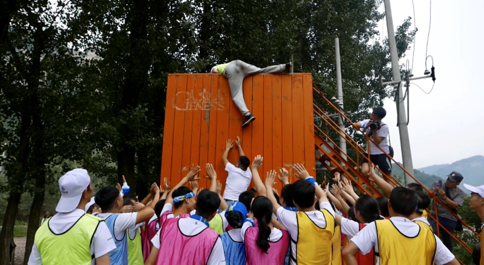 過教練的指導,隊員們迅速行動起來,強壯的男隊員自發的成為人肉梯,讓后面的隊員踩著他們的腿和肩膀向上爬,上面的隊員拼命拉